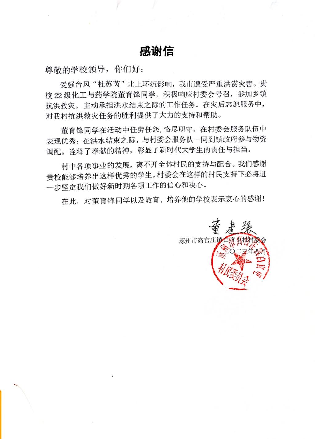 近日,我校接到涿州市高官庄镇白官屯村村民委员会的一份感谢信,信中对我院学子董育锋在抢险救灾及灾后志愿服务中的表现提出表扬,并对学校的教育及培养表示感谢。